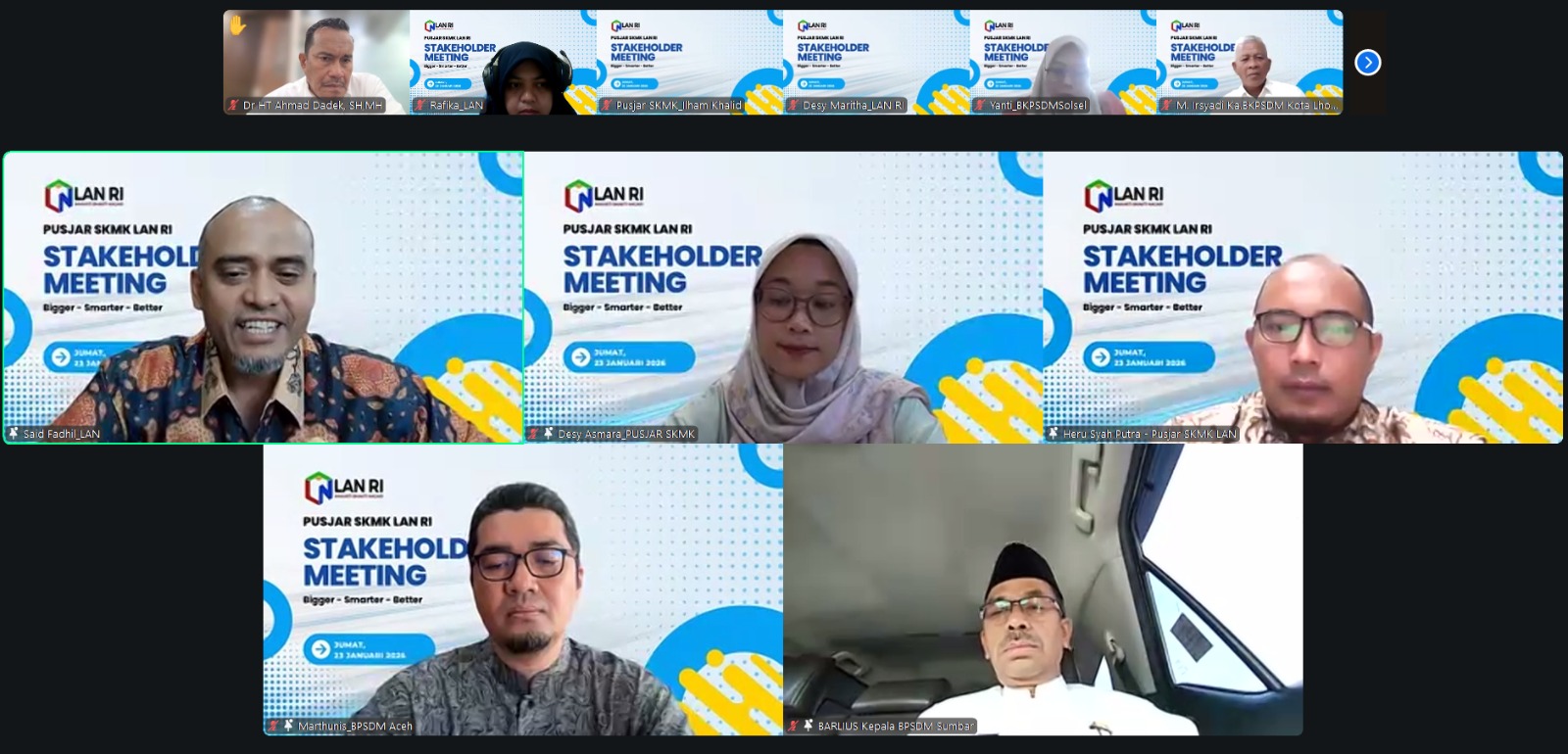 Banda Aceh, 23 Januari 2026 — Pusat Pembelajaran dan Strategi Kebijakan Manajemen Kinerja (Pusjar SKMK) Lembaga Administrasi Negara (LAN) menyelenggarakan Stakeholder Meeting Daerah Bencana Sumatera yang diikuti oleh perwakilan Pemerintah Provinsi serta Pemerintah Kabupaten/Kota se-Aceh, Sumatera Utara, dan Sumatera Barat. Kegiatan yang dilaksanakan secara daring ini menjadi forum strategis untuk membahas penguatan kapasitas Aparatur Sipil […]