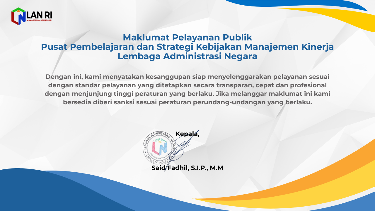 Keputusan Kepala Pusat Pembelajaran dan Manajemen Kebijakan Strategi Kinerja Nomor 058/P.4/HKM.02.2/2025 tentang Standar Pelayanan di Lingkungan Pusat Pembelajaran dan Manajemen Kebijakan Strategi Kinerja menjadi pedoman dalam memberikan pelayanan, penyediaan, dan penyampaian informasi publik yang berisi pedoman mengenai: