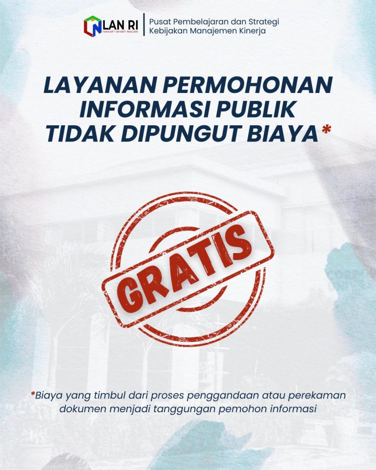 Pejabat Pengelola Informasi dan Dokumentasi Pusat Pembelajaran Strategi Kebijakan dan Manajemen Kinerja (Pusjar SKMK) Lembaga Administrasi Negara menyediakan informasi publik secara GRATIS (tidak dipungut biaya), sedangkan untuk penggandaan atau perekaman, pemohon/pengguna informasi publik dapat melakukan penggandaan/fotocopy sendiri di sekitar gedung Pusjar SKMK atau menyediakan flashdisk/hardisk eksternal untuk perekaman data dan informasinya
